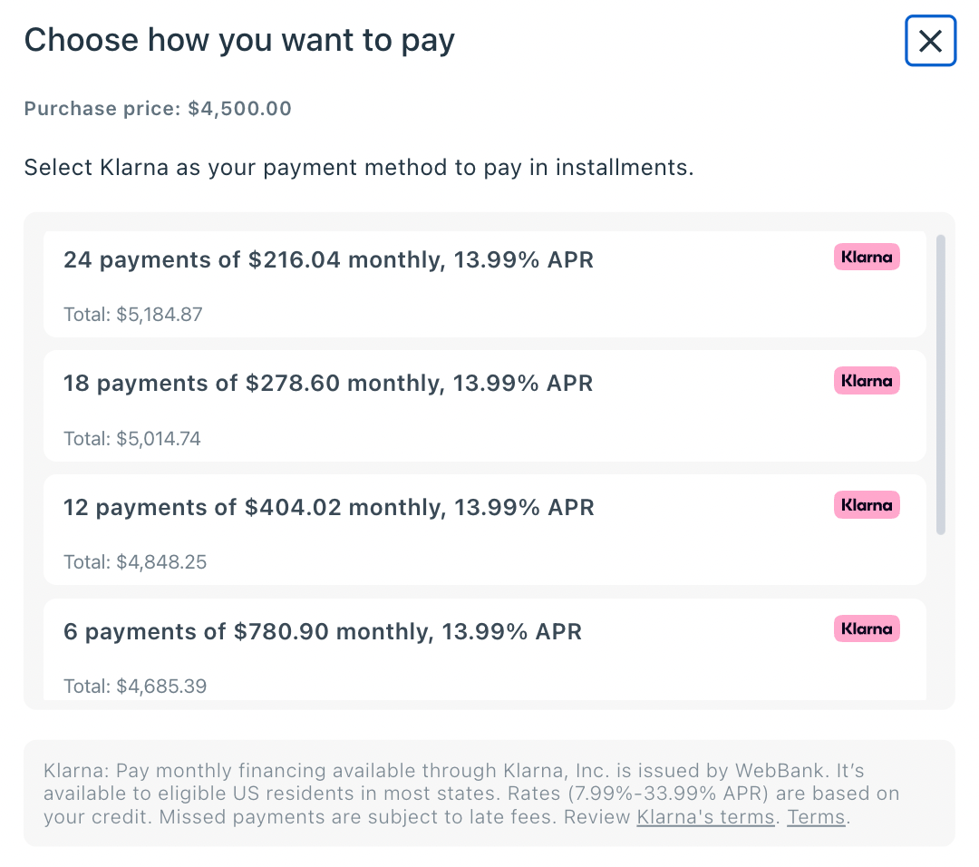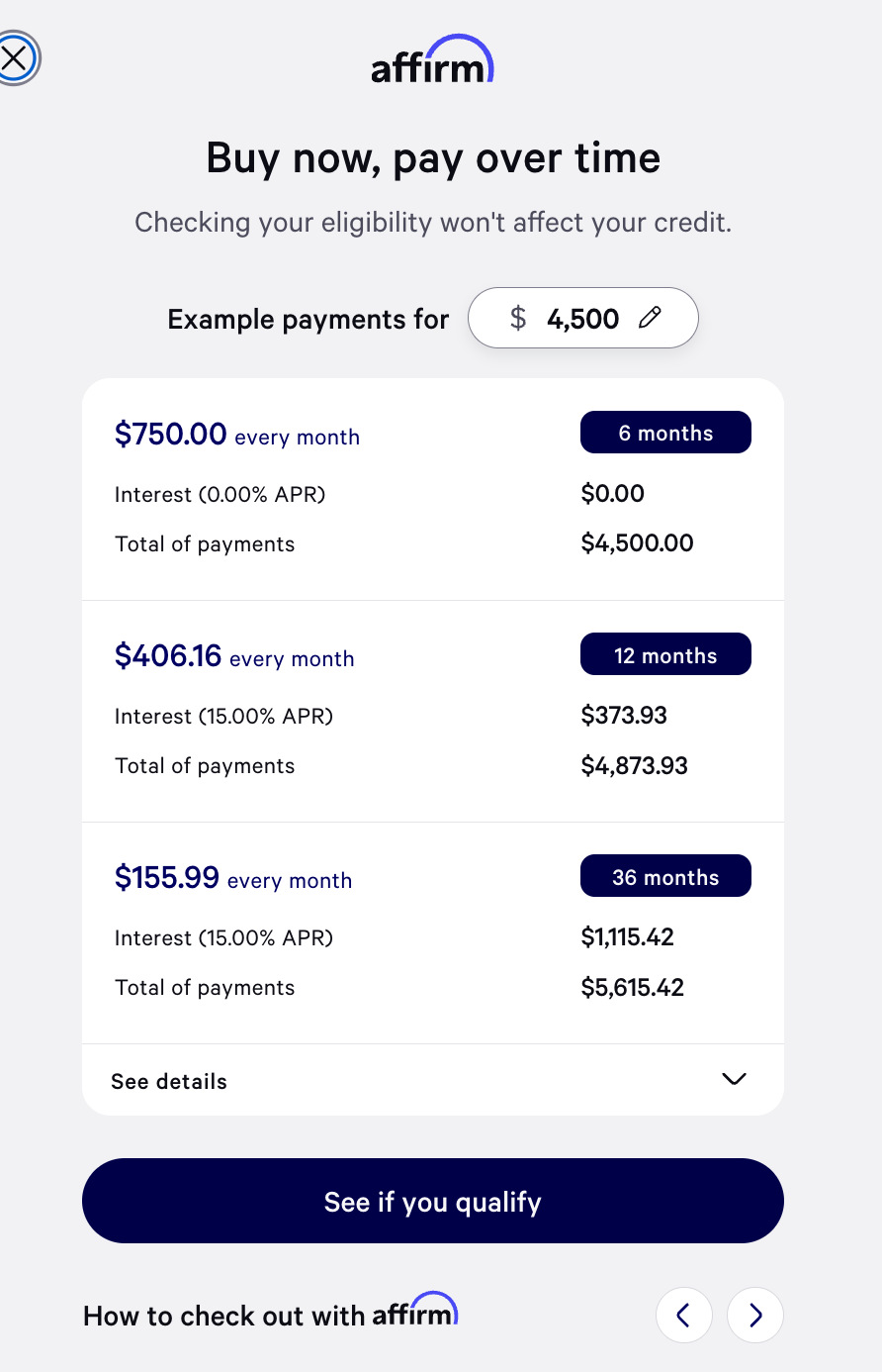 One Payment of $4500 (Monthly financing available through Affirm or Klarna. See screen shot at bottom)